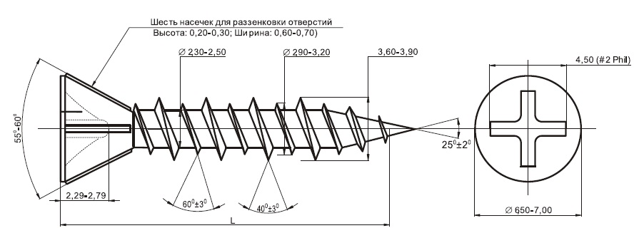 | Маркировка | Номинальный диаметр D (мм) | Длина самореза L (мм) | Наружный диаметр D1 (мм) |